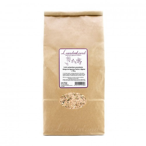 Lunderland Licht verteerbare groentemix 750 gramDeze licht verteerbare samenstelling is ideaal voor een normale dagelijkse voeding, maar bijzonder geschikt vooral puppy's, dieren met een gevoelige maag en dieren die herstellen van een ziekte. Zij profiteren van de zeer goed…